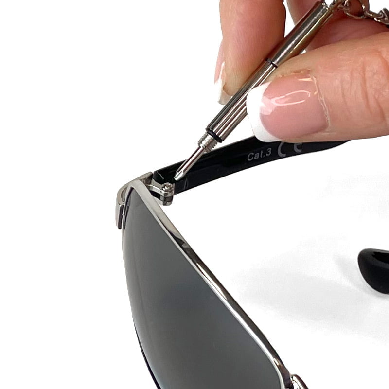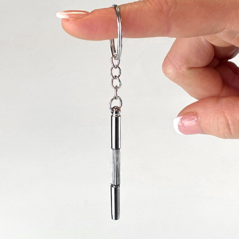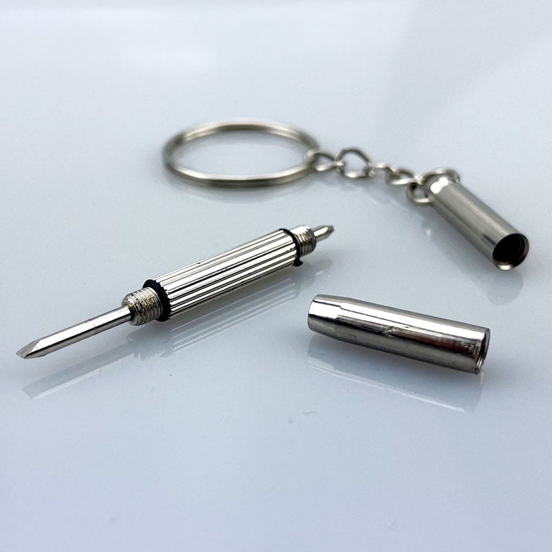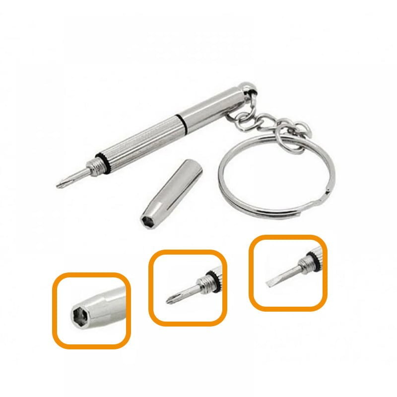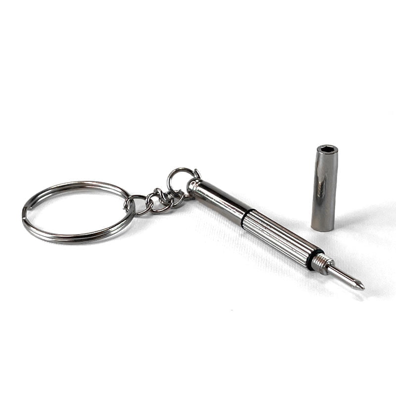 Små skruvar och muttrar kan även dom lossna och när det händer har du ett passande verktyg nära tillhands. Denna mejsel för glasögon har 3 funktioner i 1. Förutom en spårmejsel finns även en stjärnmejsel för mycket små skruvar. Dessutom kommer verktyget även med en inbyggd mutternyckel som kan vara till hjälp i många fall. Sist men inte minst är verktyget försett med en nyckelring för enkel förvaring.